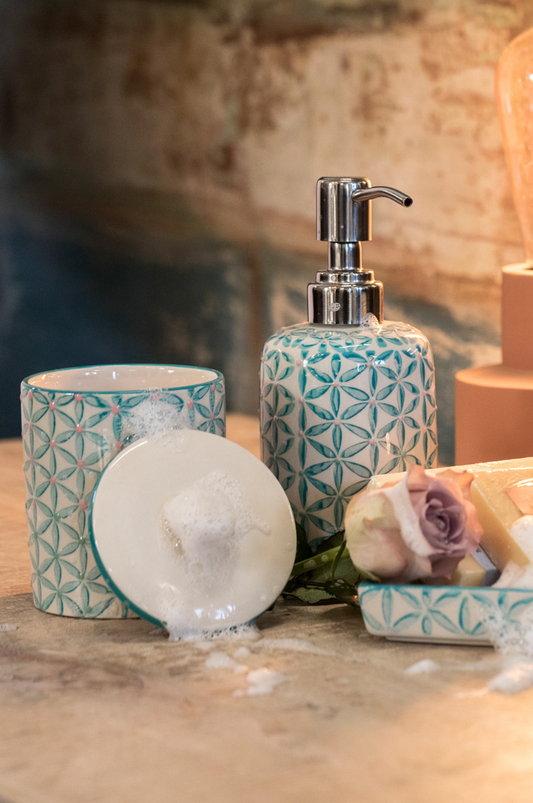 Una colección práctica, que decora de forma elegante tu baño y lo hace más acogedor. Puedes combinarlos según tus necesidades: bandeja y dos dispensadores, uno para crema y otro para jabón; bandeja con dispensador y vaso para la pasta de dientes o simplemente la bandeja para poner los anillos y pulseras que te quitas antes de ducharte.
